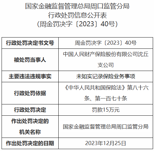 行政处罚决定书周金罚决字〔2023〕40号显示,中国人民财产保险股份有限公司沈丘支公司因未如实记录保险业务事项,被处罚款15万元。