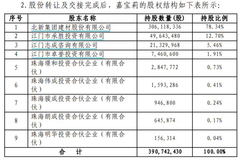 【大河财立方消息】12月29日,北新建材公告称,当日公司与世骏(香港)有限公司、江门市承胜投资有限公司等交易对手方签署了《关于嘉宝莉化工集团股份有限公司的股份转让协议》,约定公司受让嘉宝莉化工集团股份有限公司78.34%股份,转让价格为40.74亿元。转让完成后公司持有嘉宝莉78.34%股份。