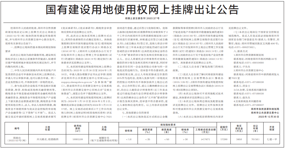 【大河财立方消息】12月30日,郑州市自然资源和规划局公告称,决定以网上挂牌方式出让郑政出〔2023〕53号(网)地块的国有建设用地使用权。