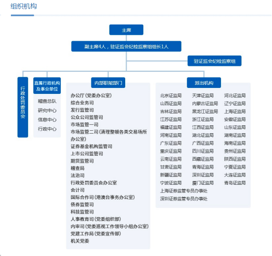 12月29日,证监会官网更新了组织机构名称以及职能说明,证监会的正司局级机构包括了办公厅、综合业务司、发行监管司、公众公司监管司、市场监管一司、市场监管二司、证券基金机构监管司、上市公司监管司、期货监管司、稽查局、法治司、行政处罚委员会办公室、会计司、国际合作司、债券监管司、科技监管司、人事教育司、内审司、党建工作局等。