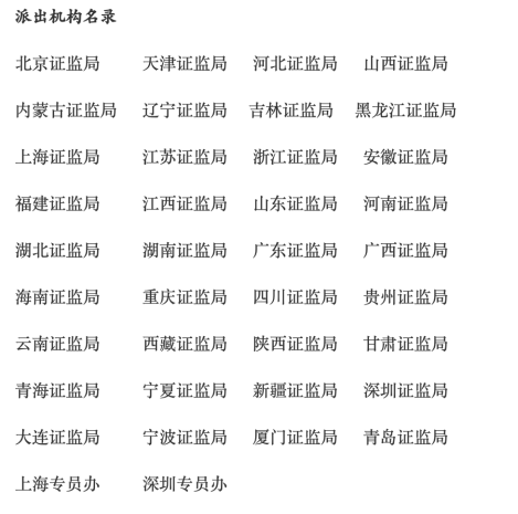 另外,证监会还设置了36个证监局和上海、深圳2个专员办。派出机构主要职责是,根据证监会的授权,对辖区内的上市公司,证券、期货经营机构,证券、期货投资咨询机构和从事证券业务的律师事务所、会计师事务所、资产评估机构等中介机构的证券、期货业务活动进行监督管理;查处监管辖区范围内的违法、违规案件。