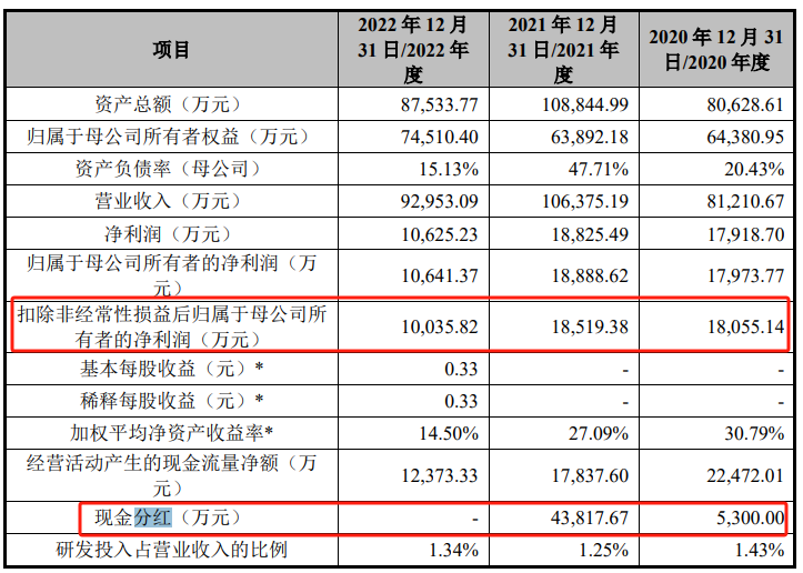 报告期内(2020年至2022年),公司营业收入分别为8.12亿元、10.64亿元和9.3亿元,归属于母公司所有者的净利润分别为1.8亿元、1.89亿元和1.06亿元。2021年公司营收增速放缓,2022年开始下滑;净利润方面,2021年其增长已接近停滞,2022年开始大幅下滑44%。