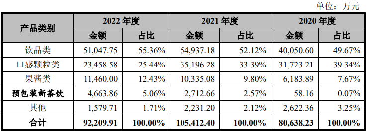 鲜活饮品招股书介绍,公司作为一家新茶饮综合解决方案的原料供应商,主要从事饮品类、口感颗粒类、果酱类和预包装新茶饮等产品的研发、生产和销售,属于新茶饮供应链的重要环节。