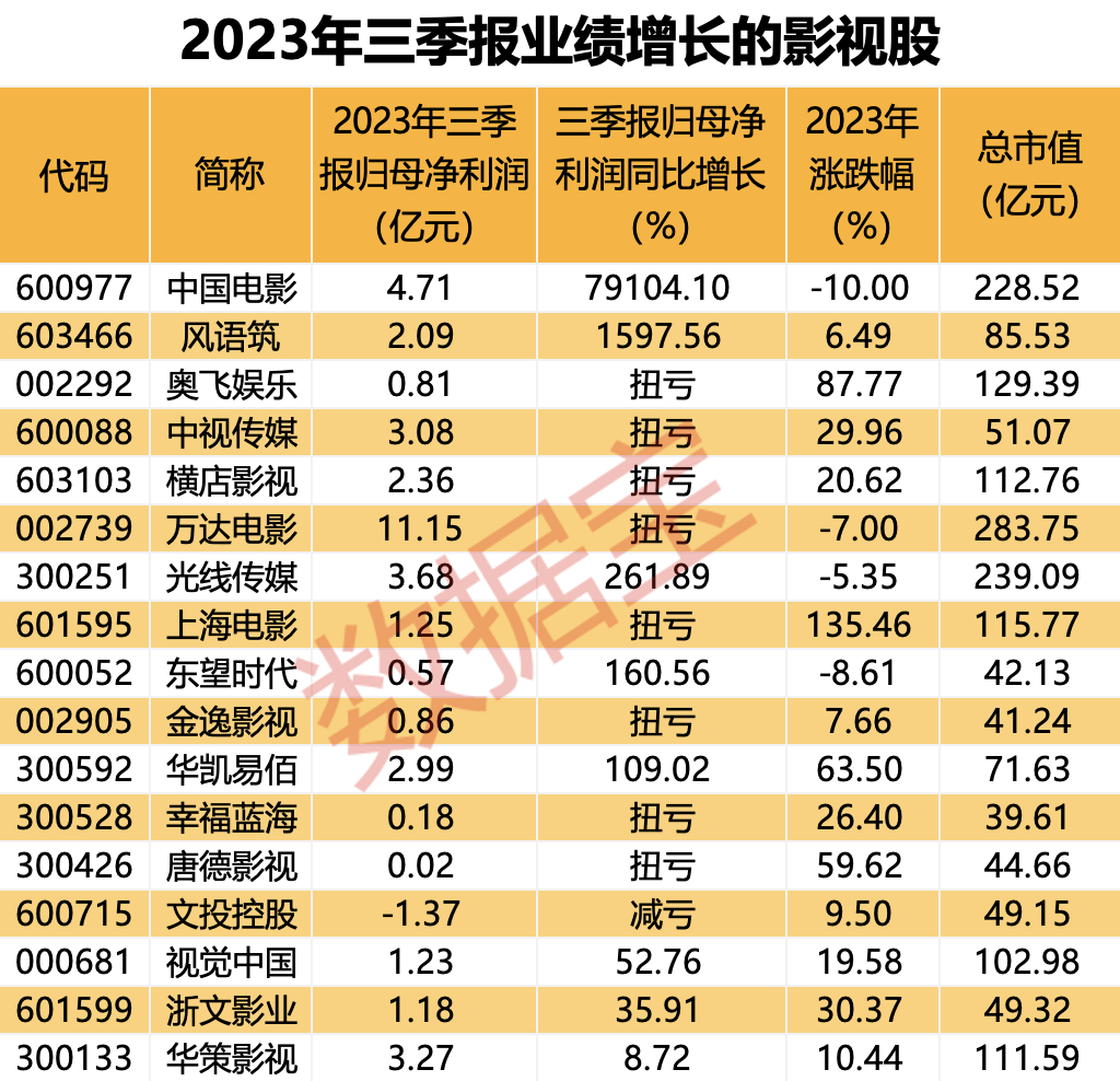 在市场明显转好的背景下,2023年前三季度,影视板块上市公司盈利能力提高,多家上市公司业绩扭亏为盈。统计显示,27家影视板块上市公司中,8家三季报净利润同比增长,8家扭亏为盈,1家减亏,报喜比例超过60%。