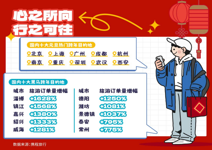 此外,景美人少的小众目的地热度依旧,元旦跨年黑马目的地前十分别是:淄博(增长1628%)、镇江(增长1568%)、嘉兴(1380%)、绍兴(1333%)、威海(1281%)、德阳(1250%)、潍坊(1081%)、景德镇(1037%)、泰安(795%)、常州(775%)。