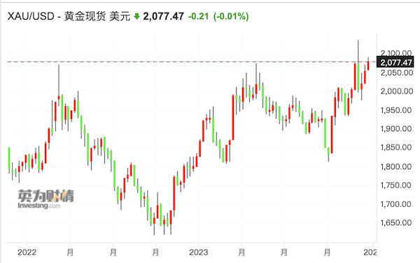 全球反通胀(disinflation)进程从2022年年中左右缓慢开始,到2023年年中,包括美联储在内的许多央行达到利率峰值。不过人们仍然认为利率将在很长一段时间内都保持在高位,这也导致金价在5月份无法干净利落地突破,当时金价曾短暂突破了2020年创下的纪录。随后它从2081美元左右大幅下跌至10月低点1810美元。