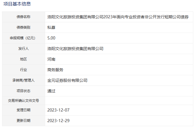 【大河财立方消息】1月2日消息,深交所固定收益信息平台显示,洛阳文化旅游投资集团有限公司2023年面向专业投资者非公开发行短期公司债券项目已获深交所通过,本期债券拟发行金额为5亿元,承销商/管理人为金元证券。