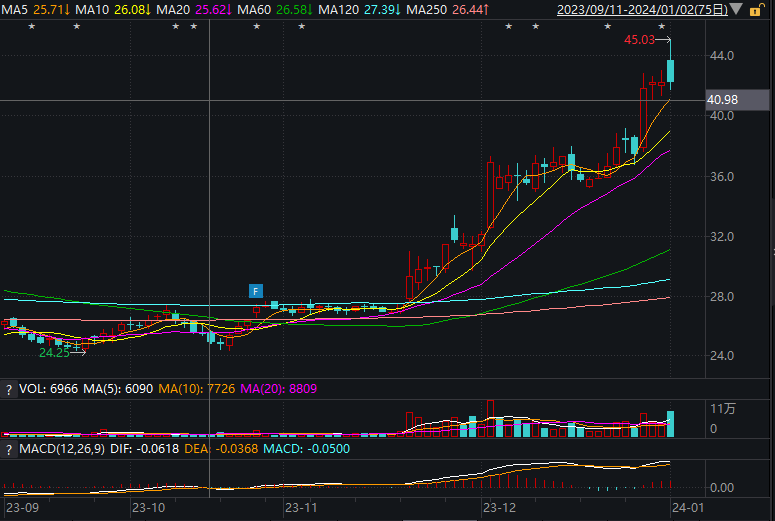 市场表现上,近期蓝盾光电持续上涨,从低点27元/股上涨至近期高点45元/股。