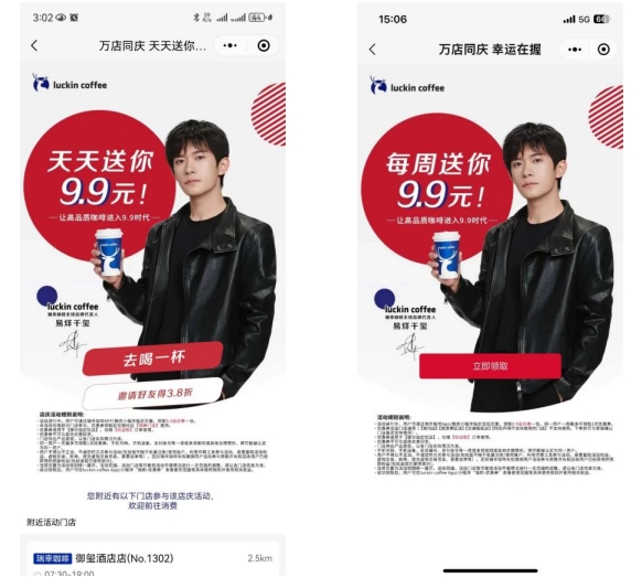 1月4日,郑州市民王波向大河财立方记者反馈,他跟朋友打开瑞幸咖啡小程序下单时发现,自己的活动海报显示“每周送你9.9元”,而朋友的活动海报则显示“天天送你9.9元”,这让他感到很困惑。