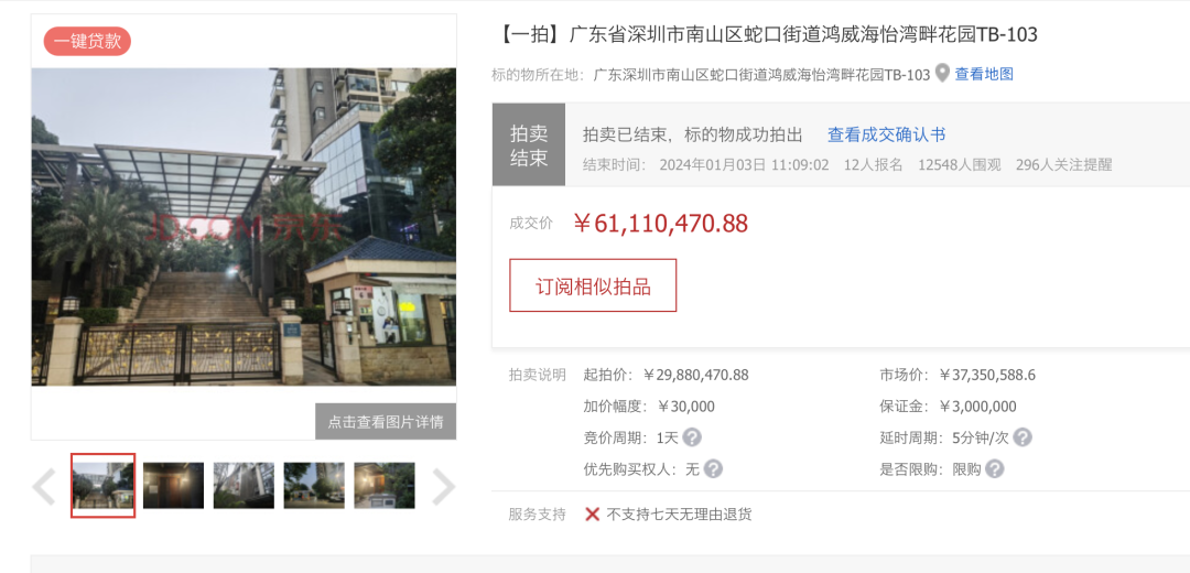 1月3日,京东拍卖上成交的一套深圳南山区法拍房引发市场高度关注。该标的物网络拍卖成交价格为6111万元,建筑面积258.7平方米,成交单价折合约23万元/平方米。