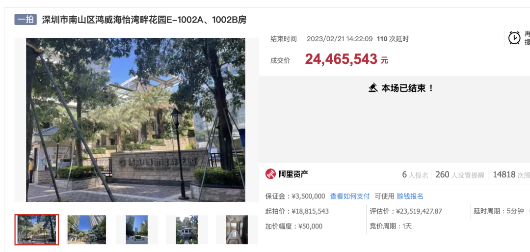 在阿里拍卖平台,上一次该小区成交竞拍还是2023年2月,彼时深圳市场处在短暂小阳春,那场拍卖共有14795次围观,260人设置提醒 ,最终有6人报名,经过长达6小时、超百轮激烈竞拍,最终被拍出。
