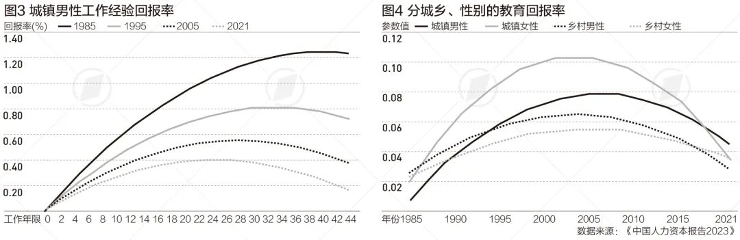 此外,报告还研究了工作经验对于收入的影响。一般情况下,收入随着工作经验的增加而增加,但增加的速度是递减的。报告显示,1985~2021年,城镇和农村的收入—经验曲线对男性和女性呈现出向下移动的趋势,代表着随着年份的推移,经验回报率是逐渐降低的。城市男性的经验回报率高于城市女性经验回报率,农村男性的经验回报率在中间年份高于农村女性经验回报率。