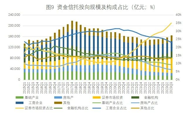 近年来投向房地产的信托资金规模和占比持续下降。3季度末,投向房地产的资金信托规模为1.02万亿元,同比下降2596.77亿元,降幅20.28%,环比下降278.68亿元,占比屡创新低至6.21%;相较于22.64万亿元的受托资产规模总量,占比为4.51%,已低至5%以下。表明传统房地产信托业务作为信托主营业态的时代已告终结。