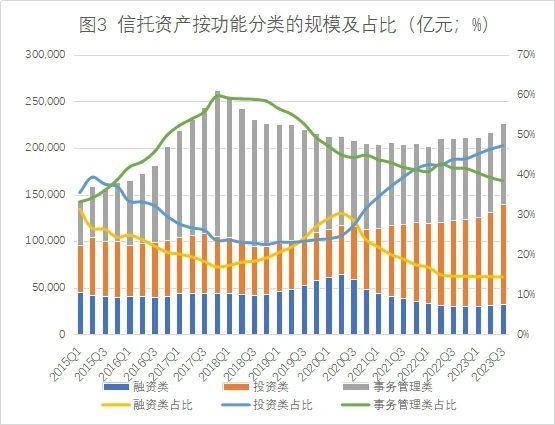 2023年3季度末,投资类信托业务规模为10.69万亿元,同比增长16%,保持住了2季度末实现的超10万亿元规模,环比增长6.43%。融资类信托规模自2020年2季度开始即进入下降通道,3季度末规模持续下降至3.25万亿元,3年来融资类信托余额下降了3.2万亿元,降幅近50%,规模占比逐步降至14.34%。事务管理类信托业务规模为8.70万亿元,占比为38.34%,规模占比持续保持在1/3以上。