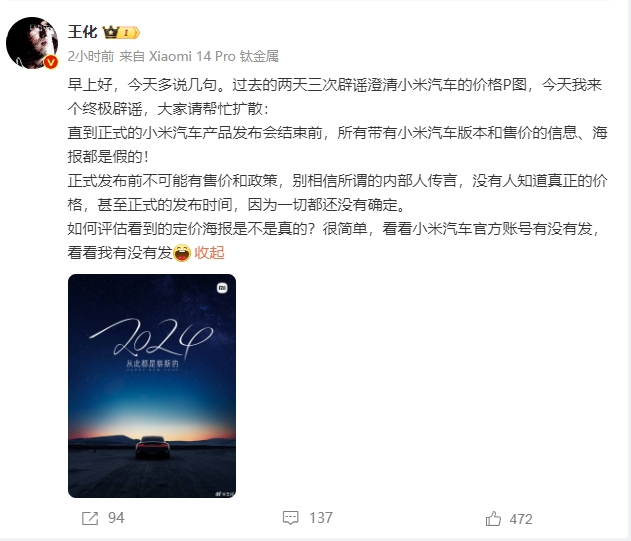在日前举行的“小米汽车技术发布会”后,关于小米SU7定价的讨论热度不减,网络上流传着包括9.9万元、36.9万元、59.9万元等不同版本。1月3日,小米集团公关部总经理王化发布微博辟谣。1月5日,王化又在微博进行“终极辟谣”,他表示,(小米汽车)正式发布前不可能有售价和政策,别相信所谓的内部人传言,没有人知道真正的价格,甚至正式的发布时间,因为一切都还没有确定。