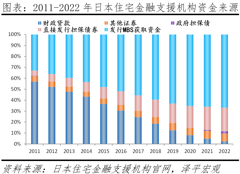 改建后的住房银行市场化程度显著提高、对财政资金依赖度大幅下降,2011-2022年,财政资金占比由57.2%降至4.4%。住宅金融支援机构的目标之一是摆脱原有住宅金融公库对财政资金的依赖、实现较充分的市场化运作。经过15年运营,其基本实现这一目标,2011年,住房金融支援机构资金来源中,财政贷款及政府担保债占比57.2%,发行MBS获得的资金占比32.9%;2022年,前者降至4.4%,后者增至66.8%。