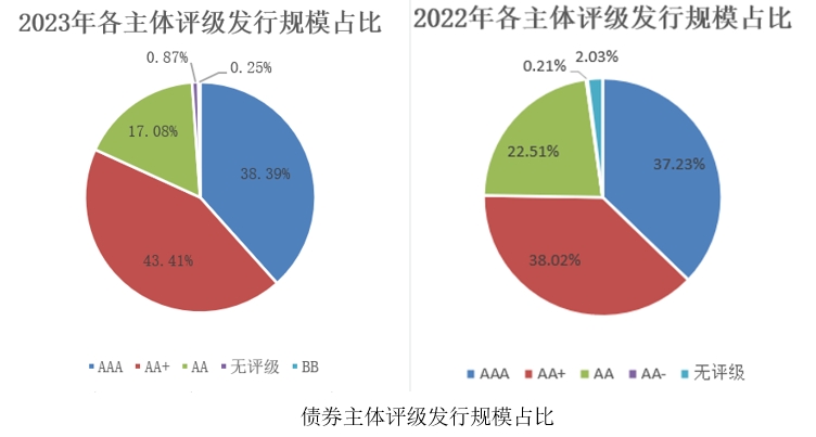 从主体评级发行规模来看,AAA主体发行量占比较去年同期略微上升,AA+主体发行量占比较去年同期小幅上升,AA主体发行量占比较去年同期小幅下降。整体来看,各评级主体发行规模占比变化不大,AA+及以上评级发行规模小幅增长,说明市场更加认可AA+以上中高评级主体。