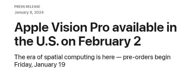 去年6月,苹果在全球开发者大会上官宣了Vision Pro,这也是公司2015年推出Apple Watch以来的首个新的产品类别。上月有知情人士透露,苹果正在加大这款头显设备的生产力度,为2月上市做准备。