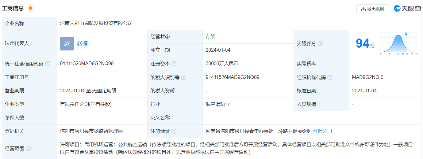【大河财立方消息】1月9日,大河财立方记者从天眼查获悉,河南大别山民航发展投资有限公司近日在信阳潢川注册成立,注册资本3亿元,法定代表为赵楠。经营范围包括民用机场运营、公共航空运输等。