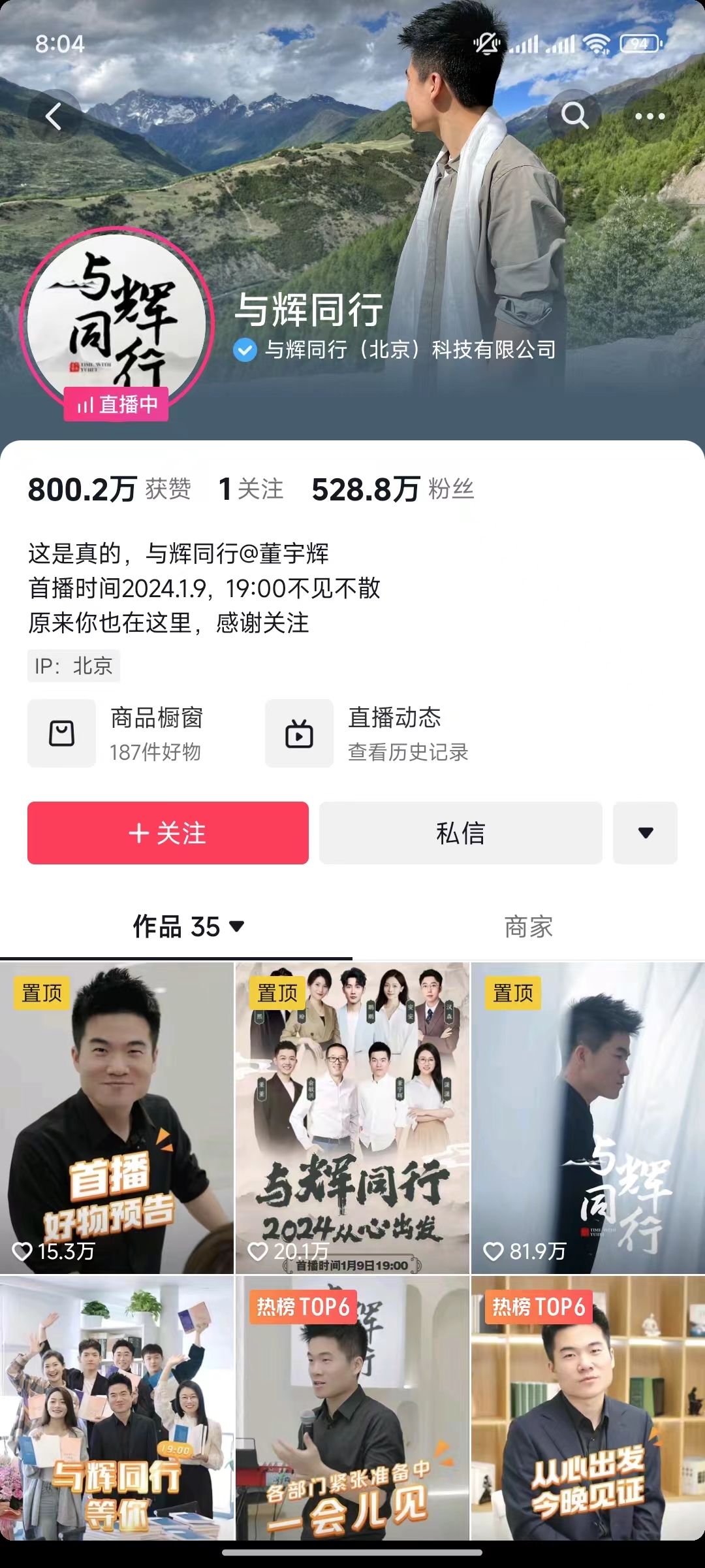 【大河财立方消息】1月9日,董宇辉抖音新账号“与辉同行”首播。