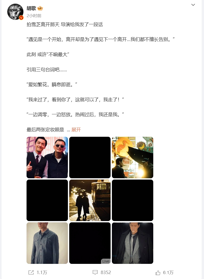 1月9日晚,剧中宝总饰演者胡歌微博发文,“拍雪芝离开那天,导演给我发了一段话:‘遇见是一个开始,离开却是为了遇见下一个离开……我们都不擅长告别。’此刻或许‘不响最大’。引用三句台词吧,‘爱如繁花,瞬息即逝。’‘我来过了,看到你了,这就可以了,我走了!’‘一边凋零,一边怒放。热闹过后,我还是我。’最后两张定妆照是我在这趟旅程中最初的样子,记得当时化妆间里刚好想起了这首歌。”