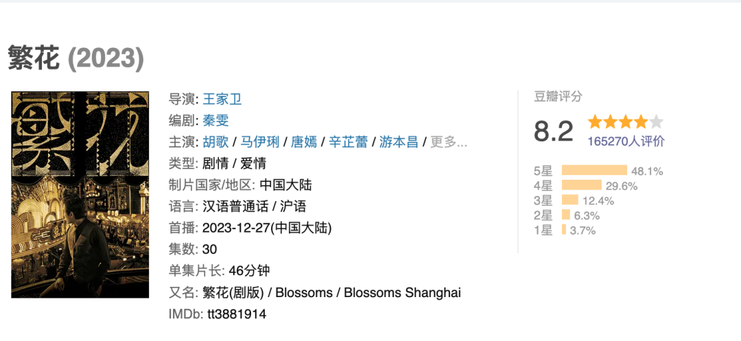 1月3日,《繁花》在豆瓣开分8.1,1月9日,截至发稿,一共有超16万网友在豆瓣为《繁花》评分,最新评分8.2。其中48.1%的观众打出五星好评,29.6%的观众打出四星好评——从豆瓣评分曲线来看,《繁花》的“好”也是毋庸置疑的。