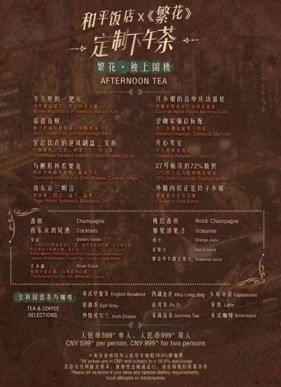 此外,和平饭店还推出了联名《繁花》的“繁花·独上阁楼”定制下午茶,单人599元、双人999元,需要加16.6%服务费。