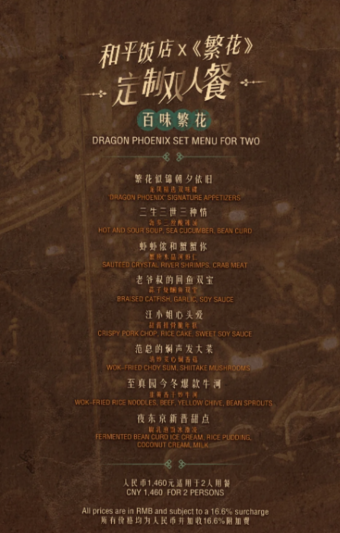 此前,和平饭店顺势推出了与《繁花》联名的“百味繁花”定制双人餐,售价1460元,并加收16.6%的服务费,即总价1702元,每天仅限量20套。