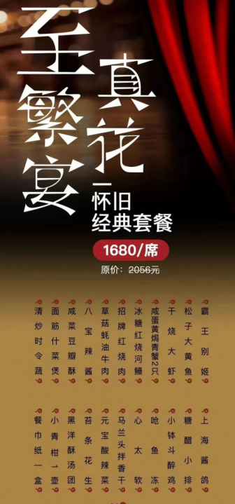 此外,剧中出现的至真园原型——苔圣园酒家(黄河路店)也受到热捧。该饭店也推出了《繁花》同款套餐,价格为1680元/席。