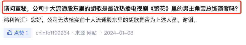 1月8日,鸿利智汇在投资者互动平台上回应称,公司无法核实前十大流通股东里的“胡歌”是否为《繁花》里的男主角宝总饰演者。