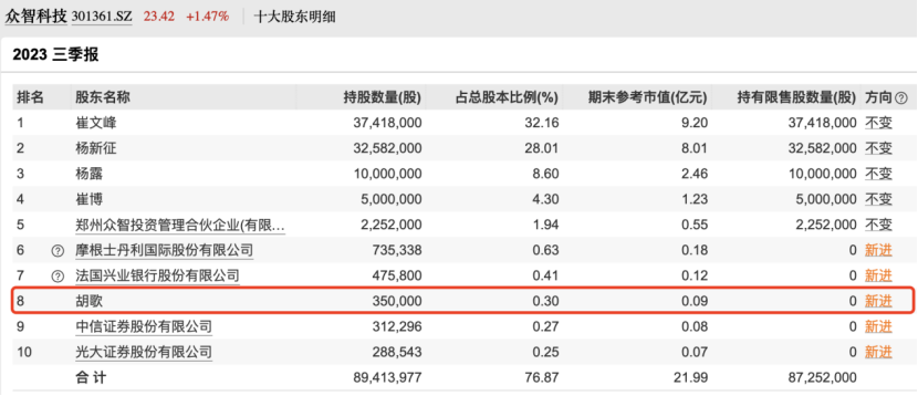 截至2023年三季度末,胡歌为众智科技的第八大股东,持股数为35万股,持股占比为0.3%。