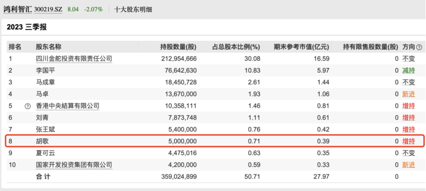 据Wind数据显示,截至2023年三季度末,胡歌为鸿利智汇第八大股东,持股数为500万股,持股占比为0.71%。