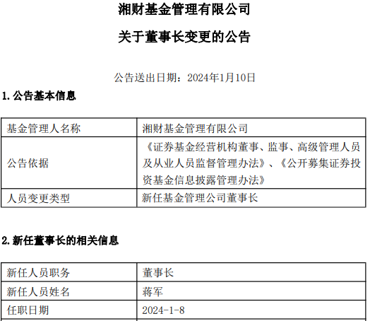 【大河财立方消息】1月10日,湘财基金发布公告称,王小平不再担任公司董事长,由蒋军担任公司新任董事长,任职日期为1月8日。自2018年7月湘财基金成立以来,王小平为公司首任董事长。