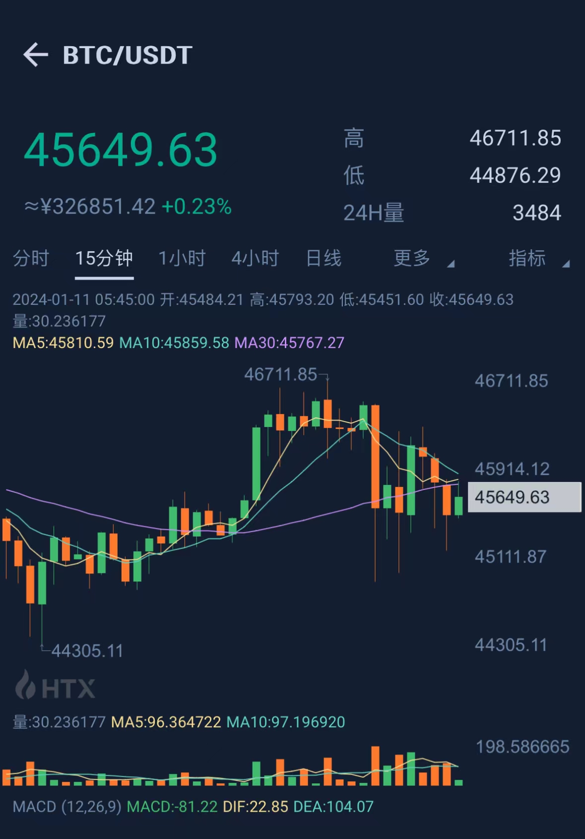 截至发稿,比特币价格微涨,报45649美元/枚。