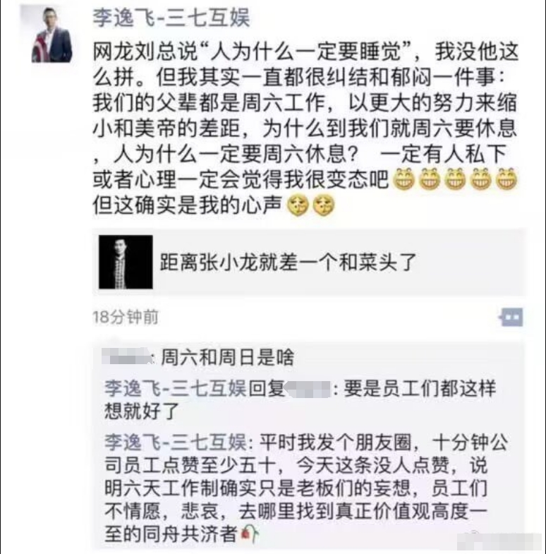 近日,一张三七互娱创始人、董事长李逸飞的朋友圈截图被热传。李逸飞在评论一篇文章时提到,“我们的父辈都是周六工作,为什么到我们就周六要休息,人为什么一定要周六休息?一定有人私下或者心理一定会觉得我很变态吧,但这确实是我的心声。”该言论引发热议。