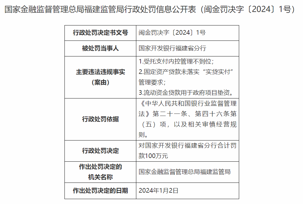 国家开发银行福建省分行因受托支付内控管理不到位;固定资产贷款未落实“实贷实付”管理要求;流动资金贷款用于政府项目垫资,被罚款100万元。