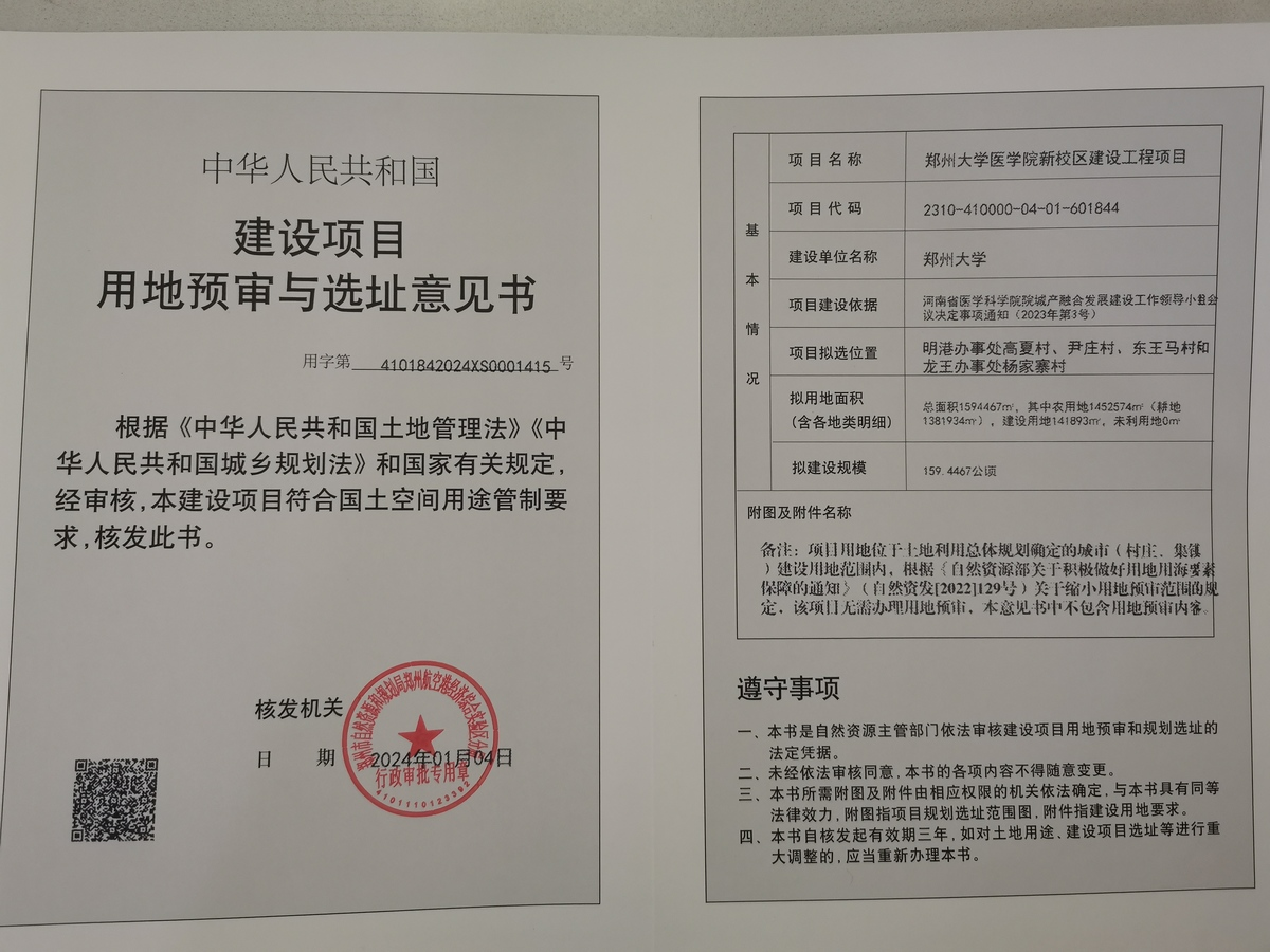 【大河财立方消息】1月12日,郑州航空港官网显示,近日,郑州大学医学院新校区建设工程项目用地预审与选址意见书批后公示。