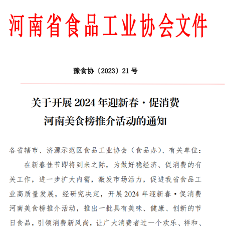 1月12日,大河财立方记者从河南省食品工业协会获悉,为贯彻落实河南省经济工作会议精神,稳经济、促消费,激发市场活力,进一步扩大内需,助力豫酒振兴,促进河南食品工业高质量发展,2024年迎新春·促消费河南美食榜暨河南好酒发布推介活动将于1月18日在郑州举行,届时,将推出一批美味、健康、创新的节日食品,引领消费新风尚,让广大消费者过一个欢乐、祥和、简约、丰盛的新春佳节。