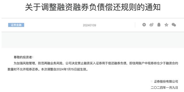 近期,有头部券商发布了调整融资融券负债偿还规则的通知。根据通知,公司决定禁止融资买入证券用于偿还融券负债,即信用账户中现券持仓少于融资合约数量时不允许现券还券。本次调整自2024年1月15日起生效。