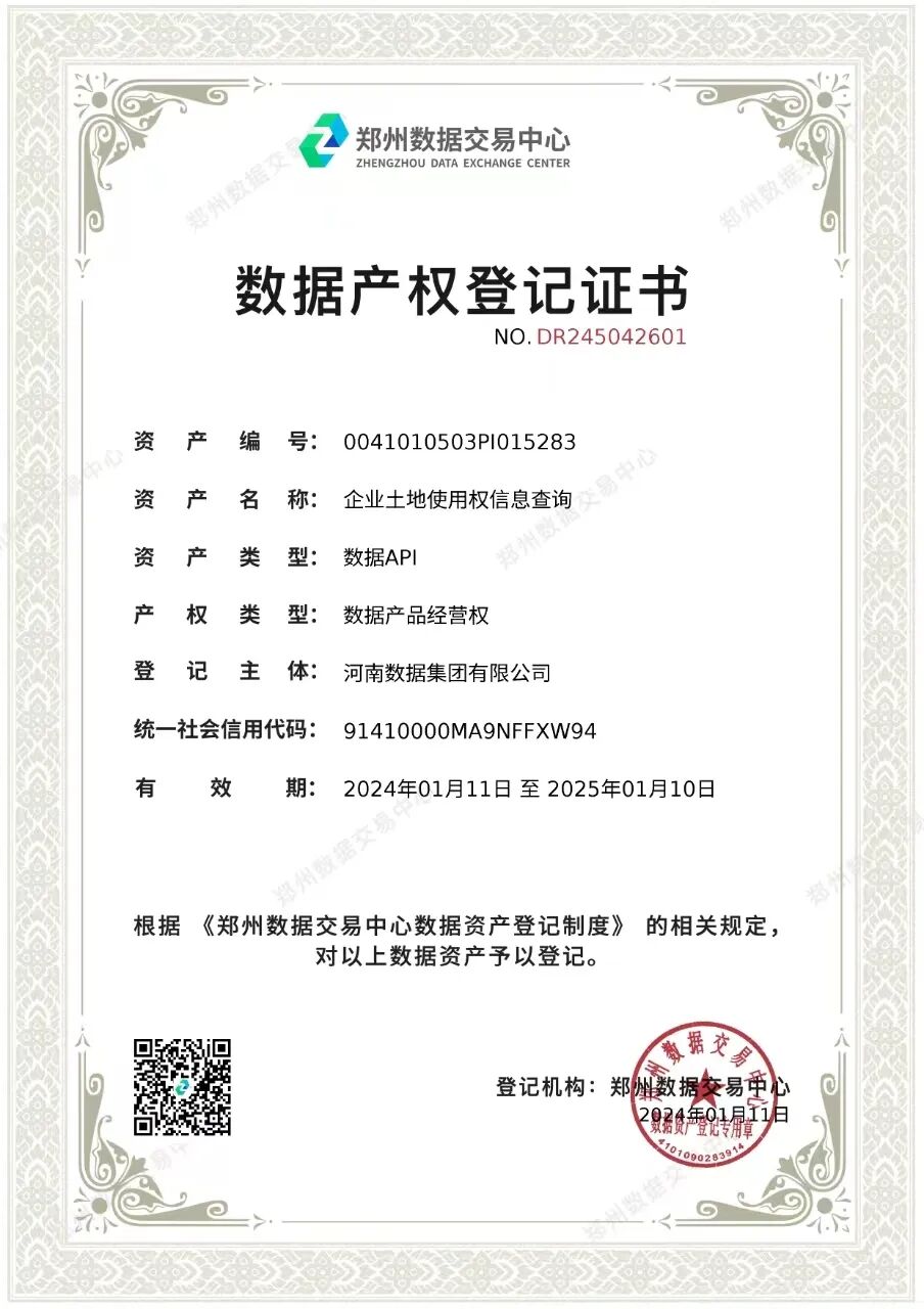 2024年1月11日,在河南数据集团揭牌成立一周年之际,河南数据集团“企业土地使用权”数据在郑州数据交易中心挂牌上市,获颁“数据产权登记证书”。金融机构根据会计师事务所、资产评估事务所、律师事务所有关意见,向河南数据集团批准授信额度800万元,完成了河南省首笔数据资产无抵押融资案例。