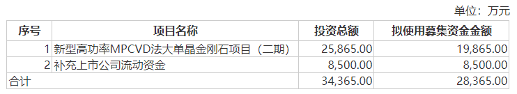 申报稿显示,新型高功率MPCVD法大单晶金刚石项目(二期)实施主体为公司全资子公司三磨所,项目总投资25,865万元,其中拟使用本次募集资金19,865万元。