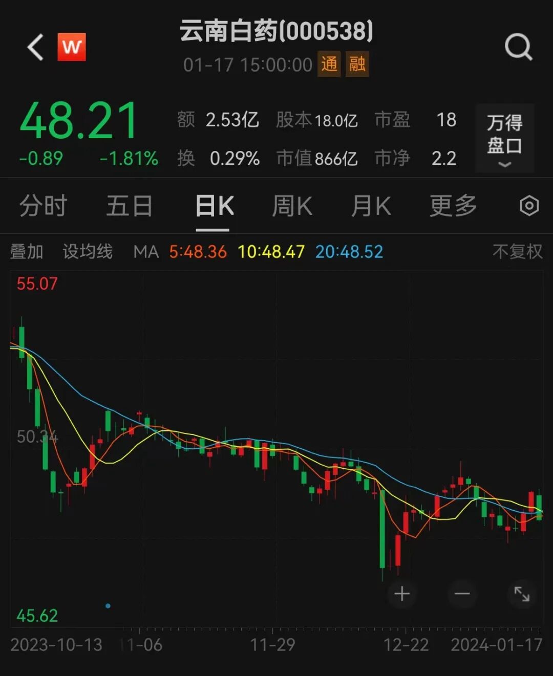 截至1月17日,云南白药股价收于48.21亿元,最新市值为866亿元。