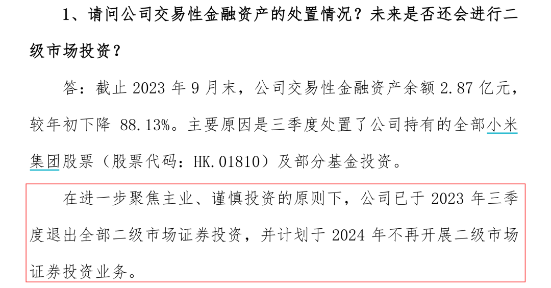 会议记录显示,截至2023年9月末,公司交易性金融资产余额为2.87亿元,较年初下降88.13%。主要原因是三季度处置了公司持有的全部小米集团股票及部分基金投资。