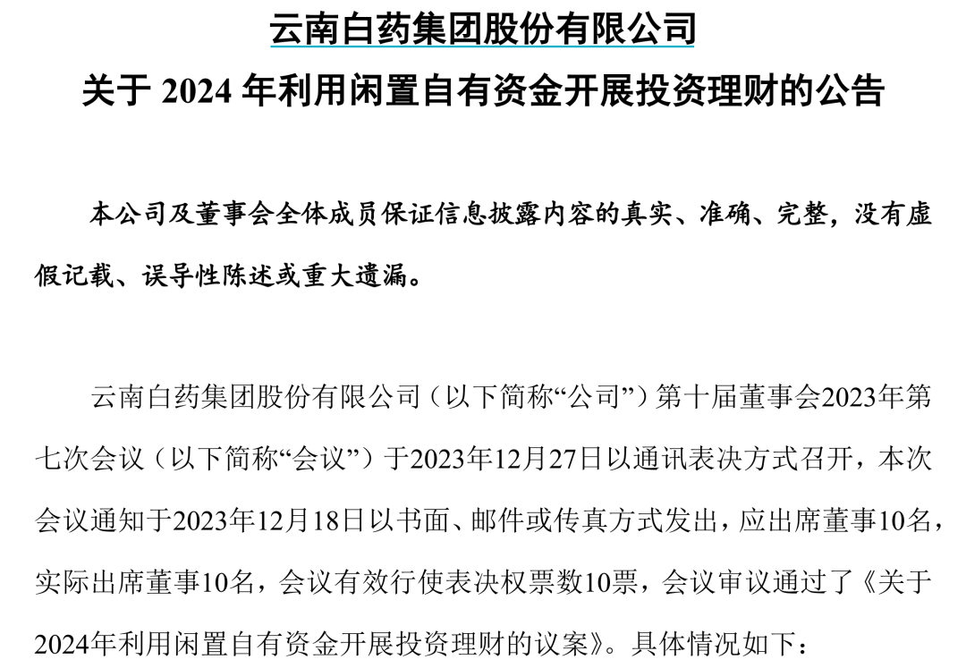 另一方面,不再炒股的云南白药决定把闲置资金投资理财产品。2023年年底,云南白药发布公告称,公司在2024年拟利用自有闲置资金投资银行的存款类产品,包括大额存单、通知存款、协定存款等;各大金融机构的理财产品,包括银行及其理财子公司、券商、基金公司等,以及货币市场基金、国债逆回购及债券、债券型基金或资管计划。