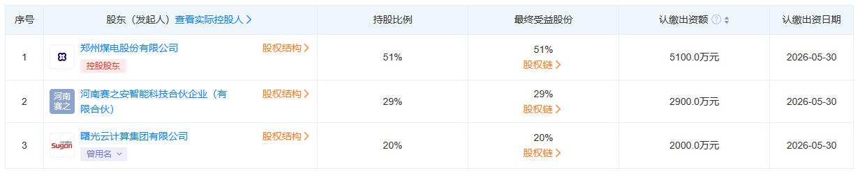 天眼查股权穿透显示,该公司由中科曙光旗下曙光云计算集团有限公司、郑州煤电、河南赛之安智能科技合伙企业共同持股。其中,郑州煤电为控股股东,持股比例51%。