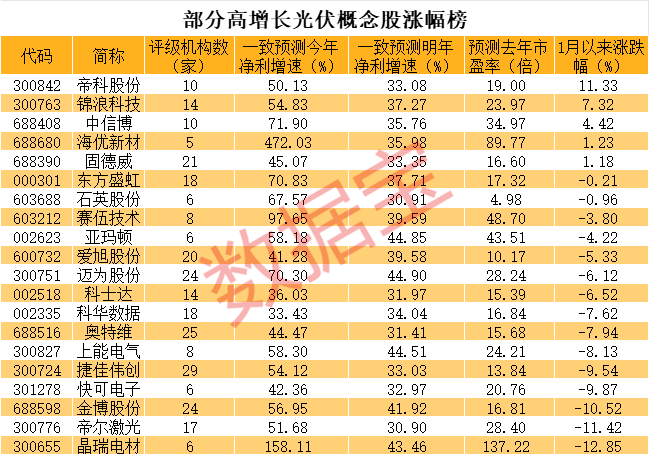 部分个股估值较低,石英股份机构一致预测去年市盈率不足5倍,爱旭股份、捷佳伟创、科士达等个股机构一致预测去年市盈率均不足20倍。从市场表现来看,这些个股年内表现也相对较为抗跌,平均跌幅不足4%,跑赢大盘。其中,帝科股份1月以来大涨超11%,锦浪科技、中信博、海优新材、固德威等个股均逆市上涨。值得一提的是,在北向资金净流出的背景下,榜单中还有帝科股份、固德威、赛伍技术等个股年内获得北上资金增持。