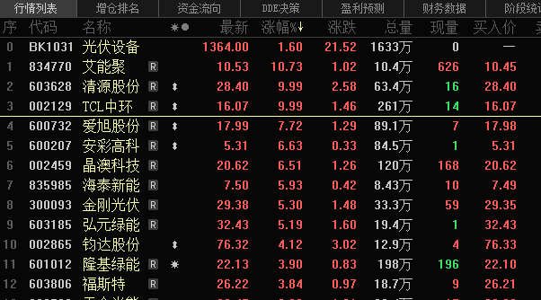 但光伏设备板块表现亮眼,上午收盘涨1.6%。个股方面,TCL中环涨停,爱旭股份、晶澳科技、隆基绿能等多只个股涨超3%。