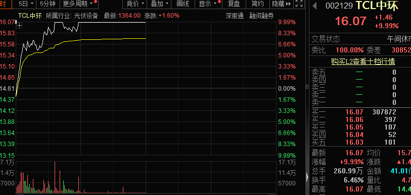 今天早盘TCL中环低开后直线拉升,10点钟出头一度封上涨停,数分钟后涨停被砸开,震荡十多分钟后再度封死涨停板。截至午间收盘,该股收报16.07元,上涨9.99%,封单超过30万手,市值达650亿元。