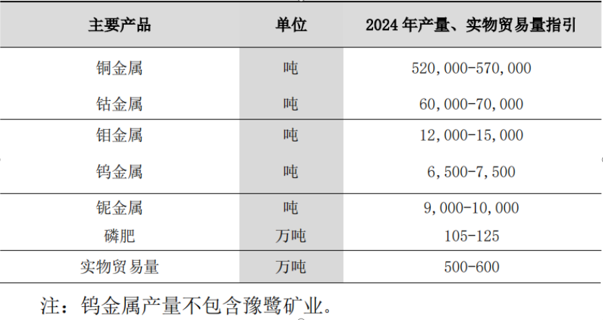 根据指引,公司2024年计划产铜(按金属量计,下同)52万~57万吨,产钴6万~7万吨,较2023年增加铜产能10万吨以上、钴产能1万吨以上。此外,公司计划产钼1.2万—1.5万吨,产钨0.65万~0.75万吨,产铌0.9万~1万吨,产磷肥105万~125万吨,实现实物贸易量500万~600万吨,较2023年保持稳定。