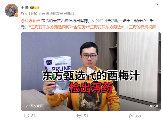1月18日,王海在微博发文称,东方甄选带货的一款名为“TiQ天萁西梅汁”的产品,被检出有泻药成分。王海方面向南都湾财社记者提供的资料显示,该产品宣称进口美国,经销商为郑州麦绘商贸有限公司。